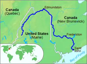 Many Loyalist refugees from the American Revolutionary War resettled in Saint John at the mouth of the river and in Sainte-Anne des Pays-Bas which was renamed Fredericton.[6] The Saint Croix River formed the Atlantic coastal boundary at the close of the war keeping the Saint John River in Canada while the Penobscot River was allocated to Massachusetts. The Treaty of Paris (1783) defined the eastern boundary of Massachusetts as a line drawn due north from the source of St. Croix River to the drainage divide of the Saint Lawrence River.[9] Persistent hostilities with the Wolastoqiyik had prevented the English treaty signatories from mapping the river headwaters. Aside from ambiguity as to which tributary might be considered the source of the Saint Croix River, the Saint John River does not flow directly south as might have been assumed from knowledge of the better mapped Hudson and Connecticut Rivers. Of greater concern to Canada, however, was discovery of how close the drainage divide was to the south bank of the Saint Lawrence, leaving Canada with a narrow band of unfavorable terrain for construction of a road to connect Atlantic Canada to Quebec through the winter months when ice closed the Saint Lawrence. Canada chose to interpret the treaty's intention as keeping the entire Saint John drainage basin under Canadian control. Surviving Acadian and Wolastoqiyik refugees continued to resist British rule while moving upriver to the Acadian Landing Site west of the Saint Croix treaty boundary where they were joined by other Acadian refugees who had fled to Quebec.[10]