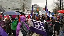 The NAACP of Portland withdrew its support of the protest, accusing the original organizers of failing to discuss discrimination affecting minority groups, specifically immigrants, Muslim women, and women of color.[5][24][25] The group's president, Jo Ann Hardesty,[34] said she was told that those issues, along with anti-Trump and Black Lives Matter messaging and signage, were "too political".[5] As a result of the affiliate's criticism, the small group of women from Eastern Oregon who served as the original organizers of the Portland event were replaced with new leaders to "[give] a larger platform to women of color".[4][5] After the NAACP chapter was made aware of the leadership changes, Hardesty explained: "I felt it was important that we not miss this teachable moment about what role of race and religion and class were playing in pulling this march together."[5] Furthermore, she told Willamette Week: "Putting a black woman's face at the beginning of the march doesn't fundamentally change the reason we withdrew our support. It's always been the case that if somebody suffers a racist incident, you're just supposed to suck it up and then, for the sake of unity, let's all join hands and pretend it didn't happen. I'm just at a place where I don't think that's healthy or wise anymore."[24]