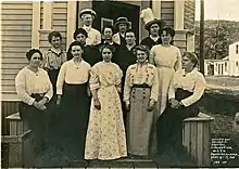 While non-native women had largely gained voting rights, Alaskan Natives still had an uncertain path to be able to vote.[9] Some indigenous women were considered citizens through their marriage to white men, but most Alaska Natives were not considered citizens of the United States.[15] The Alaska Native Brotherhood (ANB) was formed in 1912 to support the civil rights of Natives.[16] The Alaska Native Sisterhood (ANS) was formed three years later in 1915.[17] A law passed by the Territorial Legislature allowed Alaskan Natives to vote if they gave up their "tribal customs and traditions."[18] Native women largely were not able to vote after the passage of the Nineteenth Amendment because of questions about their citizenship.[19]