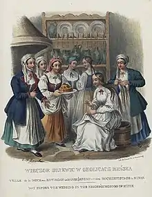 A group of Belarusian women, wearing their national costumes, while getting the bride (seated) ready for her wedding day, dated before 1841.