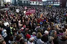It is said that in 1975, women in the workplace made 60% less than their male counterparts. Many were unable to work as they had to stay at home to do the housework and raise the children.[35] On Friday, October 24, women left their formal and informal work at 14:05 (2:05 pm), the time at which they would have earned their day's wage had they been paid at the same average rate as men.[36] The scale of the event was very large, involving 25,000 women in a country with just 220,000 inhabitants. In Reykjavik, almost 90% of the women participated.[37]
