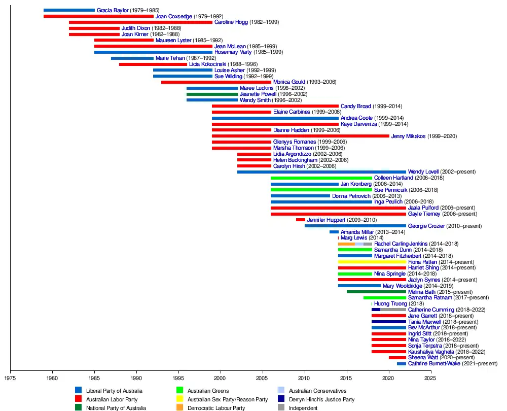 | 11 | Louise Asher* | Liberal | Monash | 3 October 1992 – 18 September 1999 (transferred to LA) |