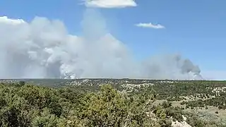 By the morning of July 1, the fire had damaged an unknown number of structures. The fire kept growing with the help of dry fuels and steep topography. Air quality, due to the smoke traveling east and northeast, was impacted in Crystal, New Mexico.[5] Fort Defiance, Arizona, Sawmill, Arizona, and Navajo, New Mexico experienced poor air quality due to smoke.[6]