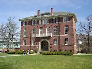 Martin Hall was built in 1870 at a cost of $22,855, and is the oldest building in Woodburn Circle.[7] It is constructed of brick and has a mansard roof with slate shingles. The architecture is of the Second Empire Eclectic style, with two principal floors, plus an attic floor and a rusticated semi-basement. The facade has nine bays, the central bay being slightly projected with a narrow Venetian window at its centre on the first floor.