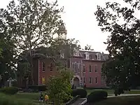 Woodburn Hall, first known as University Hall, is the central and dominating building of Woodburn Circle. It was built between 1874 and 1876, and like its neighbor, the earlier Martin Hall, is in a predominantly red brick Second Empire style building under a mansard roof. It is considered one of the finest examples of Second Empire architecture in the State of West Virginia.[5]