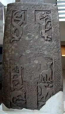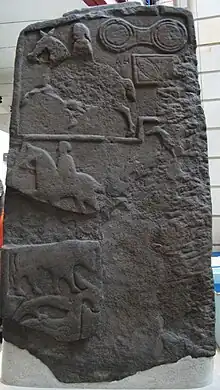 The Woodwrae Stone (alternatively the Woodwray Stone) is a Class II Pictish Stone (c. 8th or 9th century) that was found in 1819 when the foundations of the old castle at Woodwrae, Angus, Scotland were cleared.[1] It had been reused as a floor slab in the kitchen of the castle. Following its removal from the castle, it was donated to the collection of Sir Walter Scott at Abbotsford House. It is now on display at the Museum of Scotland in Edinburgh.