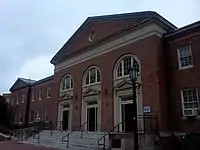 Construction was to begin within two weeks of Wright's announcements of the contract,[30] which began with the clearing of trees on site with the goal of finishing the project by January 11, 1938.[33] Excavations were finished in May after weather delays in April.[34] By January 1938, construction had been delayed due for three primary reasons: around 2,000 cubic yards of blue granite had to be removed, which was more than anticipated; a delay in the steel delivery; and heavy rains in the first three months of construction prevented trucks from operating on the ground that led to nearly 20 work days lost due to rain alone.[35][36] Arrangements were made for the presentation of the pool and gymnasium prior to their completion in March, for March 24 and 25; however, on the night of the 22nd, four students snuck into the gym and swam in the pool, which led the school to place Federal agents outside the facilities to monitor it until it was officially opened.[37][38] The two days featured several meetings, meals at the Carolina Inn, and presentation talks from President Graham and ex-Governor John C. B. Ehringhaus, among others, while the building would be formally inspected on the 25th with Woollen as the honorary guide.[37][38][39] Then physical education professor Oliver Cromwell stated that the gymnasium "[enabled] the University for the first time to provide some form of healthful activity for every member of the student body."[40] The swimming pool was donated by Nathalie Gray, wife of the late Bowman Gray Sr., and her two sons Bowman Jr. and Gordon in his memory.[41][42] The Daily Tar Heel reported that the gym could accommodate 6,000 people with the portable grandstands placed,[31][43] while Cromwell stated the maximum capacity could be 8,000.[44] The reported capacity has varied on several accounts.[N 1] The final cost for the facilities totaled to be $646,000.[43]