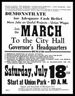 Existing local and state workers' relief organizations began to change their names to match that of the new national organization during the rest of 1935, exemplified by the Wisconsin Workers Committee changing its name to the Wisconsin Workers Alliance in becoming the state affiliate of the WAA.[7] State groups retained autonomy of action in pushing state and local governments towards unemployment relief, with the Illinois Workers Association issuing a call for a Hunger March at the state capitol in Springfield to its 226 local affiliated groups for May 21–22, 1935 — a call endorsed after the fact by National Secretary Rasmussen on behalf of the national Workers Alliance organization.[8]