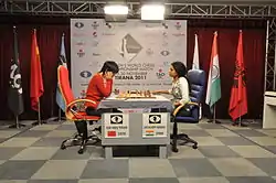 Beginning from 2010, the Women's World Chess Championship would be held annually in alternating formats. In even years a 64-player knockout system would be used, in the odd years a classical match featuring only two players would be held.[1] The 2011 edition was between the 2010 champion Hou Yifan and the winner of the FIDE Women's Grand Prix 2009–2011. Since Hou Yifan won the Grand Prix, her challenger was the runner-up, Koneru Humpy.[2]