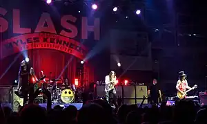 The World on Fire World Tour is the third concert tour by lead guitarist Slash as a solo artist, which started in July 2014 and was scheduled to resume in late 2015,[1] in support of Slash's third solo album World on Fire. The tour features the same backing band that performed with Slash during his two last tours, billed as "Slash featuring Myles Kennedy and The Conspirators", featuring Myles Kennedy handling lead vocal, bassist Todd Kerns, drummer Brent Fitz and rhythm guitarist Frank Sidoris.[2]