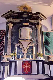 George II, being as summus episcopus the supreme governor of the Hanoveran Lutheran church, provided financial support for the construction of the Church of Zion. The hall church is oriented. Its else rather modest interior is beautified by a typical Protestant Kanzelaltar, combining pulpit and altar table, created in Rococo forms. It bears the Tetragrammaton יהוה in a top medaillon and to the left of the pulpit the king's ornamented initials GR (Georgius Rex, hidden on the photo by a painting).