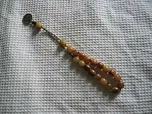 Greek worry beads generally have an odd number of beads, often one more than a multiple of four (e.g. (4×4)+1, (5×4)+1, and so on) or a prime number (usually 17, 19 or 23), and usually have a head composed of a fixed bead (παπάς "priest"), a shield (θυρεός) to separate the two threads and help the beads to flow freely, and a tassel (φούντα). Usually the length of worry beads is approximately two palm widths.[4]