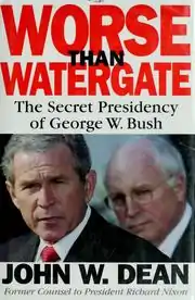 Worse than Watergate: The Secret Presidency of George W. Bush is a 2004 book by author and Watergate figure John W. Dean. Dean criticizes the secrecy employed by US President Bush and his Vice-President Dick Cheney, depriving citizens of the ability to make informed decisions, and draws parallels with the government of US President Richard Nixon for whom he served as legal counsel. He also draws attention to potentially serious issues that, as of 2004, had been given a low profile in the US media. In particular, he notes that the 18 March 2003 presidential determination, a condition of the legislation which authorized the 2003 invasion of Iraq, failed to satisfy the terms imposed by Congress and consequently would justify impeachment.