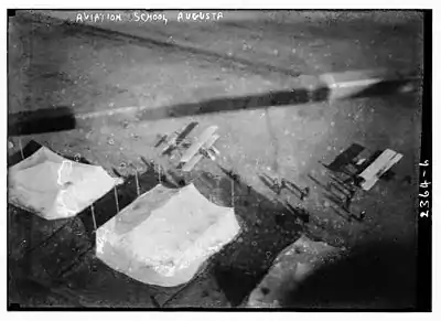 Orville Wright began training students on March 19, 1910 in Montgomery, Alabama at a site that later became Maxwell Air Force Base. With the onset of milder weather that May, the school relocated to Huffman Prairie Flying Field near Dayton, Ohio, where the Wrights developed practical aviation in 1904 and 1905 and where the Wright Company tested its airplanes. They also had a facility in Augusta, Georgia run by Frank Coffyn.[1] Some of the earliest graduates became members of the Wright Exhibition Team.