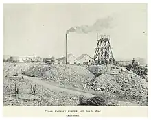 The Cobar area is most commonly associated with copper mining, but a line of mines, which were primarily for gold, stretch way from the town to its south, from Fort Bourke Hill to as far as just beyond a landform known as 'The Peak'.[12] Although it would later become a copper mine, the first of these gold mines was the Chesney Mine, opened in 1887.[4][13] The Occidental Mine was working by mid-1889.[14] It was the presence of these gold mines which gave rise to Wrightville and its neighbouring village Dapville,[15] which seems to have been largely a suburb of Wrightville.