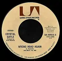 "Wrong Road Again" is a song written by Allen Reynolds, and recorded by American country music artist Crystal Gayle. It was released in September 1974 as the first single from the album Crystal Gayle.