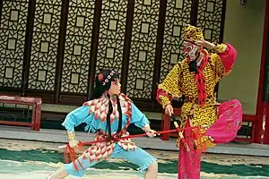 The changkao wudan (simplified Chinese: 长靠武旦; traditional Chinese: 長靠武旦; pinyin: chángkào wǔdàn; lit. 'long-armor wudan'), better known as the daomadan (simplified Chinese: 刀马旦; traditional Chinese: 刀馬旦; pinyin: dāomǎdàn; lit. 'blade-horse female'), is a woman, often an army commander, who fights on horseback in battles. Popular daomadan characters include Mu Guiying from the Generals of the Yang Family and Hu Sanniang from the Water Margin. In Peking opera, the daomadan wears a long "female armor" (女靠, nükào), which is similar to that worn by their male counterparts but with flower and phoenix embroidery as well as multicolored streamers hanging from the waist.[3] The armor is usually in red or pink. The armor restricts movement, so the daomadan is less acrobatic compared to the duanda wudan. For more freedom a "reformed armor" (改良靠, găiliángkào), which lacks the four flags in the back and fits more closely to the body, can be worn.[4] Her helmet is attached to two lingzi (long pheasant feathers). The commonly-used weapon is a long poled dao (blade) or qiang (spear).[5]