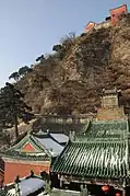 The first site of worship—the Five Dragons Temple—was constructed at the behest of Emperor Taizong of Tang.[2] Further structures were added during the Song and Yuan dynasties, while the largest complex on the mountain was built during the Ming dynasty (14th–17th centuries) as the Yongle Emperor claimed to enjoy the protection of the god Beidi or Xuantian Shangdi.[2] During the Ming Dynasty, 9 palaces, 9 monasteries, 36 nunneries and 72 temples were located at the site.[2] Temples regularly had to be rebuilt, and not all survived; the oldest existing structures are the Golden Hall and the Ancient Bronze Shrine, made in 1307.[2] Other noted structures include Nanyang Palace (built in 1285–1310 and extended in 1312), the stone-walled Forbidden City of the Taihe Palace at the peak (built in 1419), and the Purple Cloud Temple (built in 1119–1126, rebuilt in 1413 and extended in 1803–1820).[2][6] Today, 53 ancient buildings still survive. [2]