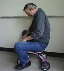 ![]() Wulf demonstrating proper riding technique of a tricycle (BYU, 2007). | |