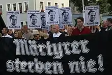 The town decided to have the Hess grave removed in 2011. The family of Rudolf Hess arranged with the cemetery to have Hess’s remains exhumed, cremated and scattered at sea to deter any further pilgrimages to his grave. The gravestone with the words "Ich hab's gewagt" ('I have dared') was removed and destroyed.[3] Smaller neo-Nazi marches continued afterward, leading the human-rights group Rechts gegen Rechts to organise a charity drive whereby a certain sum of money would be donated to the organisation Exit Deutschland, which helps neo-Nazis leave the movement, for each meter marched.[4]