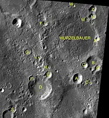 By convention, these features are identified on lunar maps by placing the letter on the side of the crater midpoint that is closest to Wurzelbauer.