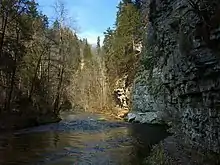 The Wutach Gorge (German: Wutachschlucht) is a narrow, steep-sided valley in southern Germany through in the upper reaches of the River Wutach with three gorge-like sections, the lowest of which is also called the Wutachflühen. The gorge cuts through the southern part of the Baar region from the eastern side of the High Black Forest heading eastwards to the Trauf the steep, northwestern flank of the Swabian Jura, which transitions to the Randen mountains here.