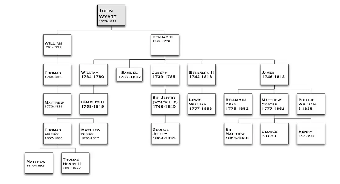 Joseph Wyatt (1739–1785), fourth son of Benjamin. He married his cousin, Myrtilla, daughter of William Wyatt (1702–1772).