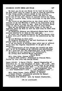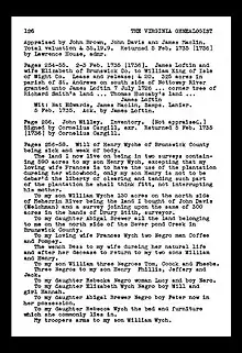 - ↑ published by The Virginia Genealogist, undetaed Brunswick County Deeds and Wills, pages 126-127, https://brouwergenealogy.blogspot.com/2018/10/the-wyche-family-of-virginia.html