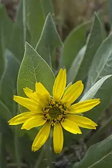 Wyethia helenioides is a species of flowering plants in the family Asteraceae[2] commonly referred to as gray mule's ears or whitehead mule-ears.
