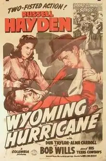 Wyoming Hurricane is a 1944 American Western film directed by William Berke and written by Fred Myton. The film stars Russell Hayden, Dub Taylor, Bob Wills, Tommy Duncan, Leon McAuliffe and Alma Carroll. The film was released on April 20, 1944, by Columbia Pictures.[1][2][3]