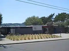 The house has three bedrooms, two living rooms, and a kitchen grouped around the perimeter, with a central utility core containing two bathrooms and utility and laundry areas.[12] Instead of the open atrium of many Eichler houses of the period, it has two interior gardens, dubbed the "entry garden" and the "game garden" by the company; there is also a children's play yard, which the two smaller bedrooms open onto, while the master bedroom has glass doors to the backyard.[8][13] The landscaping was by Douglas Baylis.[14] The thin steel supports and use of glass sliding doors both inside and along the entire rear facade create a sense of openness;[8][11] the inside entrance to the master bedroom has curtains rather than a door.[12] The house is on a ridge with views of the Coastal Range across open space preserved as watershed and a nature reserve; originally it was possible to see through the house to the hills from the street, which garden walls and gates now prevent.[13]