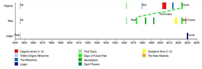 The events of the films are separated into two "timelines"; the original timeline and the new timeline.[131][132] The setting of Logan was initially implied by Hugh Jackman to be set in an alternate timeline and not following the prequel films, before director James Mangold stated that it was related;[133][134] Marvel later officially classified the film as a separate universe from the film series in the Official Handbook of the Marvel Universe A-Z. Within the Marvel multiverse, the original timeline was officially designated as Earth-10005, the events of Deadpool 2 as Earth-41633, the events of Logan as Earth-17315, while the new timeline, consisting of the prequel films, Deadpool and The New Mutants remains undesignated.[135]