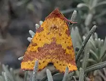 Xanthia togata, the pink-barred sallow, is a species of moth of the family Noctuidae. It is a Holarctic species, and is found throughout Europe and east through the Palearctic to Central Asia, and Siberia up to the Ussuri. The distribution area includes the United States and Canada. It was first described by the German entomologist Eugenius Johann Christoph Esper in 1788 from the type specimen in Germany