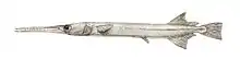 In common with other needlefish, this species has an elongate body with long, beak-like jaws filled with teeth.[6] The dorsal and anal fins are positioned far back along the body close to the tail.[6] The body is silvery-green, darker above and lighter below with a dark band running horizontally along the flank.[2] Slight sexual dimorphism exists, the male fish often having anal and dorsal fins with a black edge.[4][6] It reaches a length of 40 cm (16 in).[2]