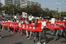 Anti-Japanese demonstrators hold a sign saying "[We] strongly condemn the Japanese!! (強烈譴責小日本!!)" during the 2012 China anti-Japanese demonstrations in Taiwan[1]