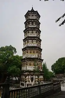 The Thousand Buddha Pagoda was originally built in the ruling of Emperor Xuanzong of the Tang dynasty (618–907) and rebuilt in 1631, during the 4th year of Chongzhen Emperor's reign in the Ming dynasty (–).[1] A modern restoration of the pagoda was carried out in 2005. The seven storeys, 46-metre (151 ft) tall, hexagonal-based Chinese pagoda is made of brick and stone. Over 250 exquisite niches with small statues of Buddha are carved on the body of the pagoda.[1]