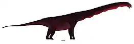 Xinjiangtitan was one of the longest known sauropods, with a long neck measuring at least 14.9 m (49 ft) in length.[1] It is estimated to have measured 27–32 metres (89–105 ft) in total body length, 25–40 metric tons (28–44 short tons) in body mass and 17 metres (56 ft) in height.[5][6][7] Xinjiangtitan was diagnosed based on the following traits: the presence of a ventral keel on the penultimate cervical centrum that forms a small semicircular process under the distal articular facet; both cervical vertebrae are relatively elongated; the sacricostal yoke except the first sacral rib; and an extremely robust femur. The series of dorsal vertebrae has a length of 3.72 m (12.2 ft). The thighbone is 1.65 m (5.4 ft) long, and the tibia is 0.98 m (3.2 ft) long.[5]