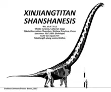 Xinjiangtitan (Chinese: 新疆巨龙; pinyin: Xīnjiāngjùlóng) is an extinct genus of mamenchisaurid sauropod that lived during the Middle Jurassic of what is now Xinjiang, northwestern China. Its type and only species is Xinjiangtitan shanshanesis (Chinese: 鄯善新疆巨龙; pinyin: Shànshàn Xīnjiāngjùlóng), known from a single incomplete skeleton recovered from the Qiketai Formation. The holotype preserves one of the most complete vertebral columns of any sauropod found in Asia, and has the longest complete neck known for any animal.