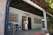 Amuzgo man in traditional dress in front of the Amuzgo Community Museum