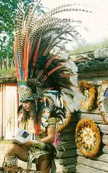 Xokonoschtletl began working as a tourist guide and became involved with indigenous activists who promoted the protection of traditional Mexican culture. He later founded the Asociación Civil Yankuik Anahuak (International Civil Association People of the Valley of Mexico), through which he has struggled for thirty years, without financial support from the government, for the return of a quetzalpanecáyotl (quetzal feather headdress) known as Montezuma's headdress housed at the Vienna Museum of Ethnology (Museum für Völkerkunde).[1][2] Apart from quetzal feathers, the headdress is ornamented with gold and precious stones, and "is considered the most valuable Mexican relic that is abroad",[3][4] Xokonoschtletl is also a member of the Frente Mexicano Pro Derechos Humanos (Mexican Front for Human Rights) and its representative to the United Nations.[1] He considers it very important that the plume be brought back to Mexico because it "is part of [Mexico's] identity and national culture".[5] As part of this movement, every year since 1986, he organizes a march that goes from the UN offices in Vienna, to the Houses of Parliament,[6] as well as artistic and cultural events.[7]