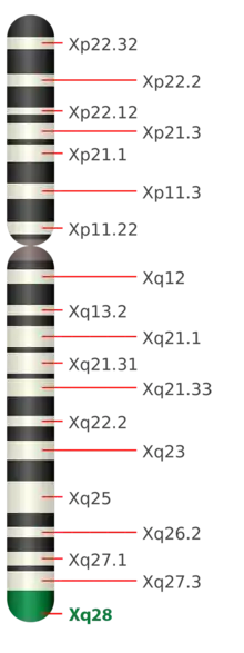 Xq28 is a chromosome band and genetic marker situated at the tip of the X chromosome which has been studied since at least 1980.[1] The band contains three distinct regions, totaling about 8 Mbp of genetic information.[2] The marker came to the public eye in 1993 when studies by Dean Hamer and others indicated a link between the Xq28 marker and male sexual orientation.[3]