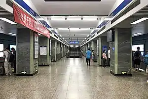 Xuanwumen Station[1] (simplified Chinese: 宣武门站; traditional Chinese: 宣武門站; pinyin: Xuānwǔmén Zhàn) is an interchange station between Line 2 and Line 4 of the Beijing Subway.[2] It is named for Xuanwumen, a former gate in Beijing's city wall that was demolished during construction of the subway. The station opened in 1971 and handles an average of 350,000 passengers per day in 2012.[3] Interchange volumes can reach per hour can reach 15,000 passengers per hour in the morning peak. The large transfer volumes overwhelm the small interchange corridors, which can narrow to only 2.4 meters in width.[4] Three new transfer corridors were added in 2020, increasing transfer capacity of the station six-fold to around 55,000 passengers per hour.[5]
