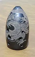 The xun (simplified Chinese: 埙; traditional Chinese: 塤; pinyin: xūn; Cantonese= hyun1) is a globular, vessel flute from China. It is one of the oldest musical instruments in China and has been in use for approximately seven thousand years.[1] The xun was initially made of stone, baked clay, or bone,[1] and later of clay or ceramic; sometimes the instrument is made with bamboo. It is the only surviving example of an earth[2] (also called "clay") instrument from the traditional "eight-tone" (bayin) classifications of musical instruments (based on whether the instrument is made from metal, stone, silk, bamboo, gourd, earth, hide, or wood).[3]