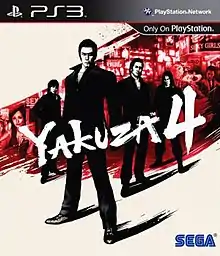 Yakuza 4 (Japanese: 龍が如く4 伝説を継ぐもの, Hepburn: Ryū ga Gotoku 4: Densetsu wo Tsugumono, "Like a Dragon 4: Heir to the Legend") is an action-adventure game developed and released by Sega for the PlayStation 3.[1] The game is the fourth main entry in the Like a Dragon series. It was introduced on July 24, 2009.[2] A promotional video was presented at the 2009 Tokyo Game Show,[3] The sequel to Yakuza 3, it was released on March 18, 2010 in Japan after a playable demo was released on the Japanese PlayStation Store on March 5.[4] Yakuza 4 was released in Europe and North America in March 2011.[5][6] A sequel, Yakuza 5 was released in 2012.