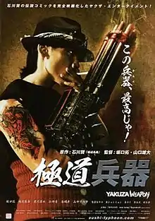 Yakuza Weapon (極道兵器, Gokudō Heiki) is a 2011 Japanese film directed and written by Tak Sakaguchi and Yūdai Yamaguchi. Based on the manga by Ken Ishikawa, the film is about Shozo Iwaki (Tak Sakaguchi) who works as a mercenary in South America. Iwaki is informed of the death of his gang boss dad and discovers his former Yakuza henchman is involved in a double-cross. Yakuza Weapon was premiered at the 2011 Yubari International Fantastic Film Festival and opened theatrically in Japan on July 23, 2011.