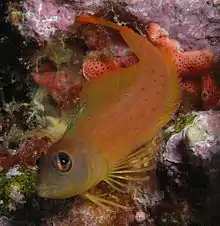 Yaldwyn's triplefin (Notoclinops yaldwyni) is a fish of the genus Notoclinops, found around the North Island of New Zealand from low water to depths of about 5 metres, most common in reef areas of broken rock, but nowhere common. Its length is between 4 and 8 centimetres. It is a pale yellow-brown with a faint orange tinge to the head, and two or three rows of small black dots on the flanks.