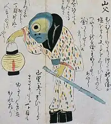 In personality, compared to the yamauba which is also a yōkai of the mountain that attacks humans, they are relatively quieter and they are sometimes deceived by humans,[6] but there are also legends where they kidnap children or domestic animals.[9] Also, like the yamauba, there are also theories that they bring fortune to people. In what was formerly Monobe, Kōchi Prefecture (now Kami), someone named Nakao received a takakibi (morokoshi) seed from a yamauba and by sowing it, a great harvest resulted. At the end of the year, a yamajijii appeared wanting mochi, so it was given a lot of it. The next year also had a great harvest and even more mochi was given to the yamajijii. In the end, as a result of this repeating many times, the yamajijii became able to eat three to (about 54.5 liters) of mochi and Nakao, who feared for his family finances, gave him burned stones which he presented as mochi and yamajijii, who was feeling hot, was given hot oil which was presented as tea. The yamajijii was surprised and fled, dying on the way. After that, the Nakao family, who once had abundant crops, declined at once.[10]