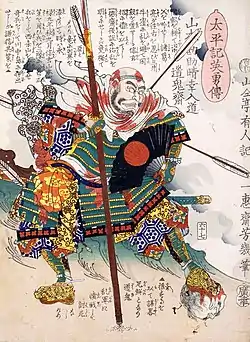 Yamamoto Kansuke (山本 勘助, 1501 – October 18, 1561) was a Japanese samurai of the Sengoku period. He was known as one of the "Twenty-Four Generals of Takeda Shingen".[1] Also known by his formal name, Haruyuki (晴幸).[2] He was a brilliant strategist, and is particularly known for his plan which led to success in the fourth battle of Kawanakajima against Uesugi Kenshin. However, Kansuke never lived to see his plan succeed; thinking it to have failed, he charged headlong into the enemy ranks, dying in battle.