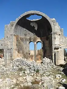 Yanıkhan was a village. There are more than 30 house ruins. The most important building is a basilica. Although the houses are completely demolished a part of the basilica survives. In addition to main abscissa there are two minor abscissas. There are two sarcophagi. One may be an arcosolium which may belong to a certain Georgios Konon Chrisyophoros who, according to an inscription, was the commissioner of the basilica. There is also a cistern to the west of the basilica.[3] 100 metres (330 ft) to the east of the basilica there is another church (called Church B by the archaeologists).