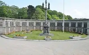 This war memorial by René Quillivic is reckoned to be Finistère's first memorial to the dead of the 1914-1918 war and was placed in front of the existing Larhantec calvary and a semi-circular wall decorated with a "Chemin de croix" by Donnart.[29][30]